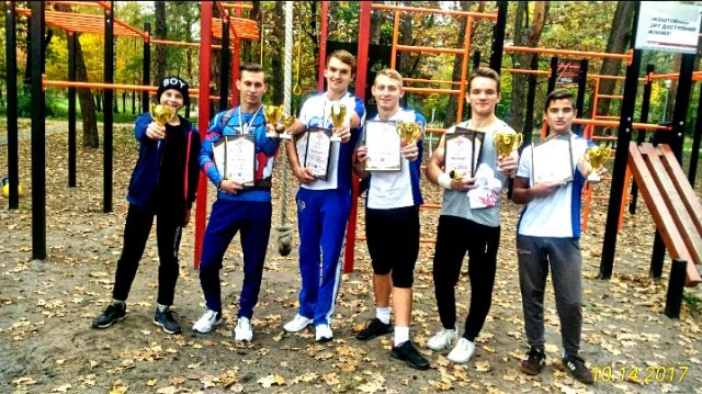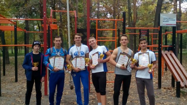 У програмі змагань були: підтягування на щаблині; віджимання від підлоги; віджимання на брусах; підняття ніг у положенні висячи; присідання.
