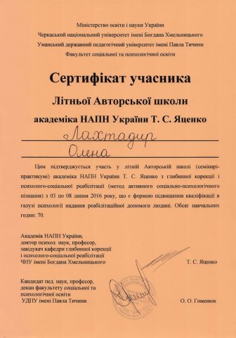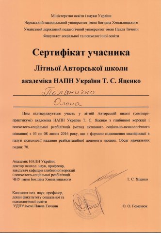 З 03 по 08 липня 2016 р. на базі Уманського державного педагогічного університету імені П. Тичини проводилися заняття Літньої авторської школи з глибинної психокорекції академіка НАПН України, доктора психологічних наук, професора, завідувача кафедри практичної психології ЧНУ ім. Б. Хмельницького Тамари Семенівни Яценко,