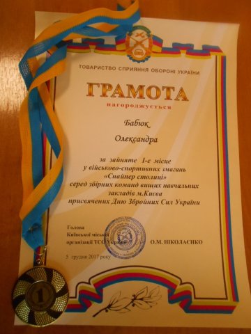Студентка 2-го курсу спеціалізація «Захист Вітчизни» Факультету здоров’я, фізичного виховання і спорту Бабюк Олександра зайняла 1-е місце серед жінок зі стрільби з АК-74 з результатом 76 з 80 можливих, залишивши суперниць з військових та інших інститутів міста Києва далеко позаду. Нагороджена медаллю та грамотою.