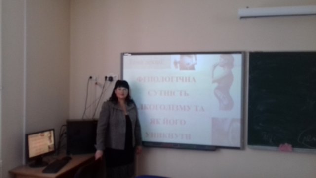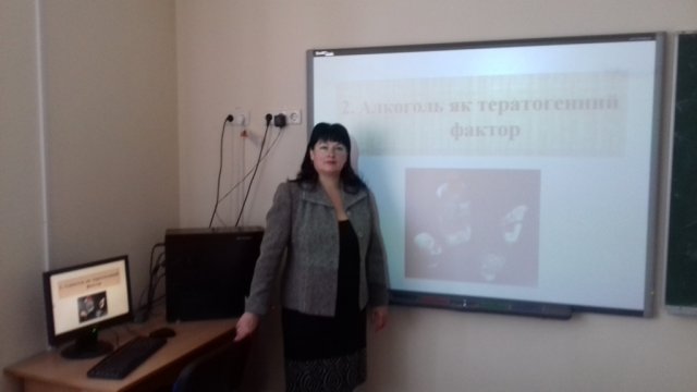 Під час лекції було розкрито поняття про тератогенні фактори, серед яких є алкоголь, шляхи потрапляння алкоголю в організм та мотиви вживання алкоголю українською молоддю, фізіологічний механізм дії алкоголю на організм, зокрема на чоловічий та жіночий, а також різних вікових груп. На завершення були висвітлені міфи про алкоголь та їх розвінчання.